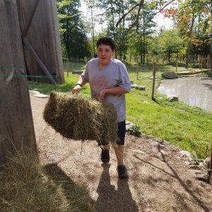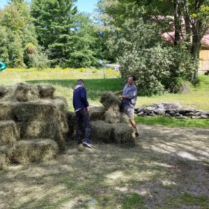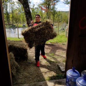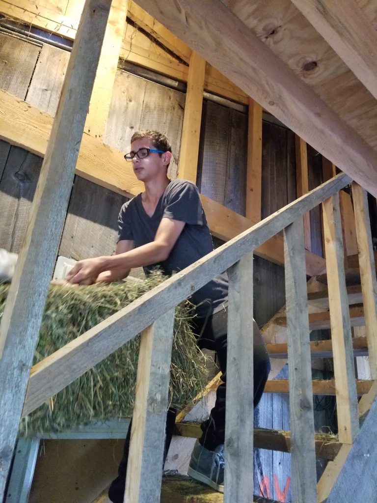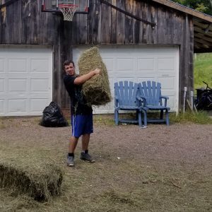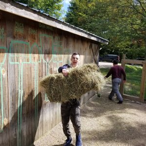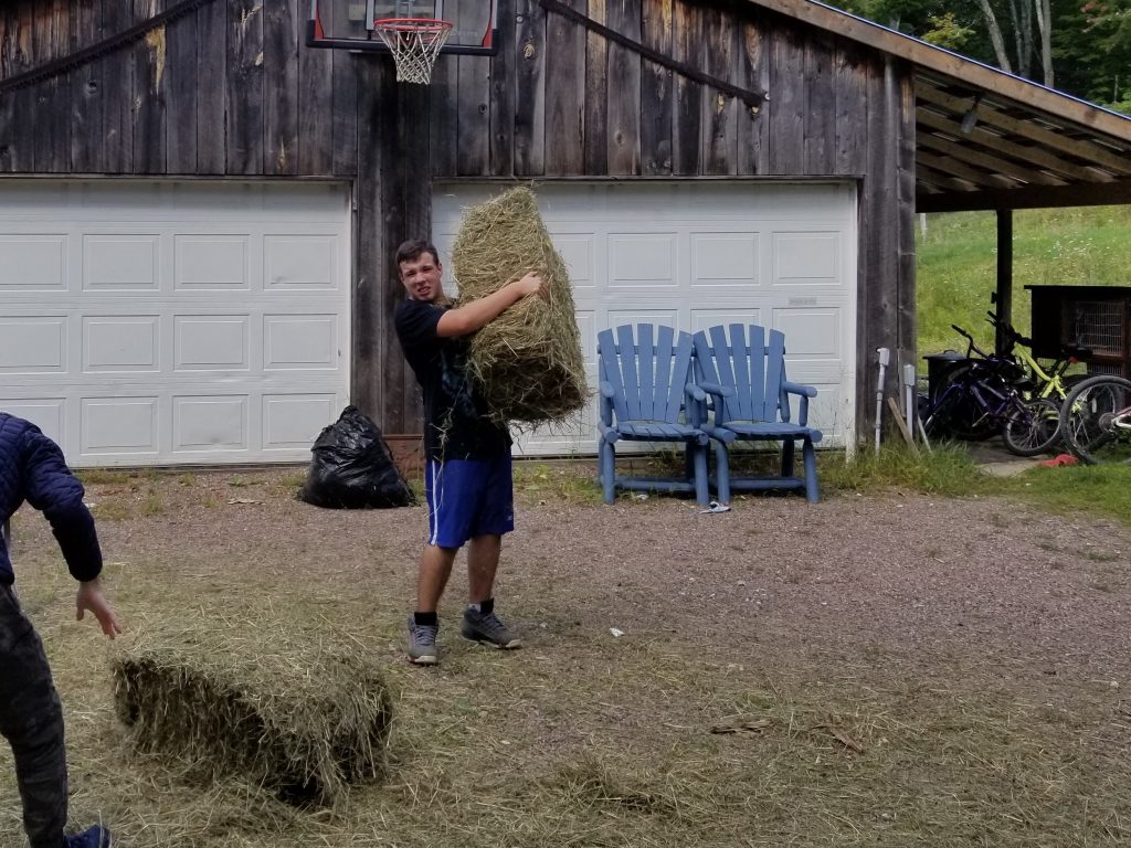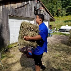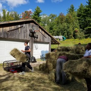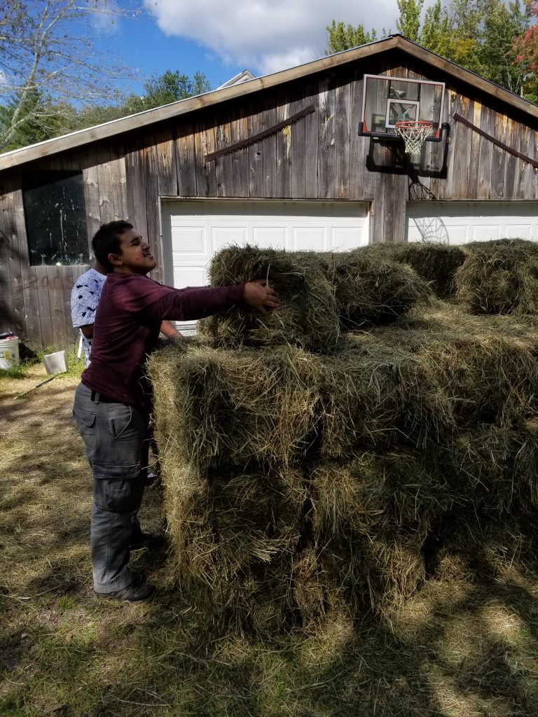 With winter just around the corner, Bellcate School is busy, busy, busy preparing our farm for the long and cold months ahead. One of the most important tasks is to put the hay up. This year we broke our standing record. 20 students and staff+130 bales of hay+30 minutes= A job finished and well done. It is always a bit daunting when we see that full hay wagon pull in, but not for this group! This year the positive attitudes, teamwork and work ethic were seamless. Several students were runners from the pile, another group made an assembly line to the stairs, a couple of folks were stationed on the stairs, and Nikki and Brooke stacked like pros in the loft. With the barn radio blasting tunes to keep us inspired, this group found the flow of how to work hard with a purpose and have fun doing it. We washed off with a garden hose at the end and everyone joked about #hayrash, one student even asking for that t-shirt to be sold at our school store (that is happening!) Having a sense of humor is a key factor in developing resilience. So, kudos to this group for their combined effort, shared experience and super positive outcome. And while we sat on the stoop eating our maple creemees at Palmers, our group laughed and shared moments from the experience turning them into a collective memory that we won’t soon forget.